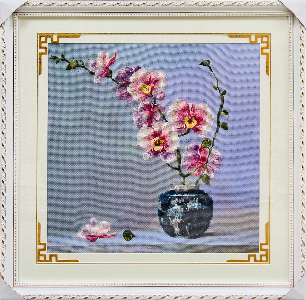 这是一幅玉兰花主题十字绣,画面以蓝色为背景,主体为一束斜插的玉兰花,花瓣粉白渐变,花蕊明黄,搭配深蓝色瓷瓶与散落的花瓣,构图简洁雅致。采用3D精准印花工艺,图案定位清晰,绣线色彩过渡自然,花瓣层次感强,整体风格偏向现代简约,适合客厅、卧室或餐厅装饰。外层为白色雕花边框,边缘有细密花纹,内层搭配金色线条勾勒的方形边框,形成双层装饰效果,与绣品的素雅风格相呼应。装裱时绣品边缘留白均匀,边框宽度适中,既避免遮挡主体图案,又通过边框的线条感增强画面的完整性,突出玉兰花与瓷瓶的细节。
