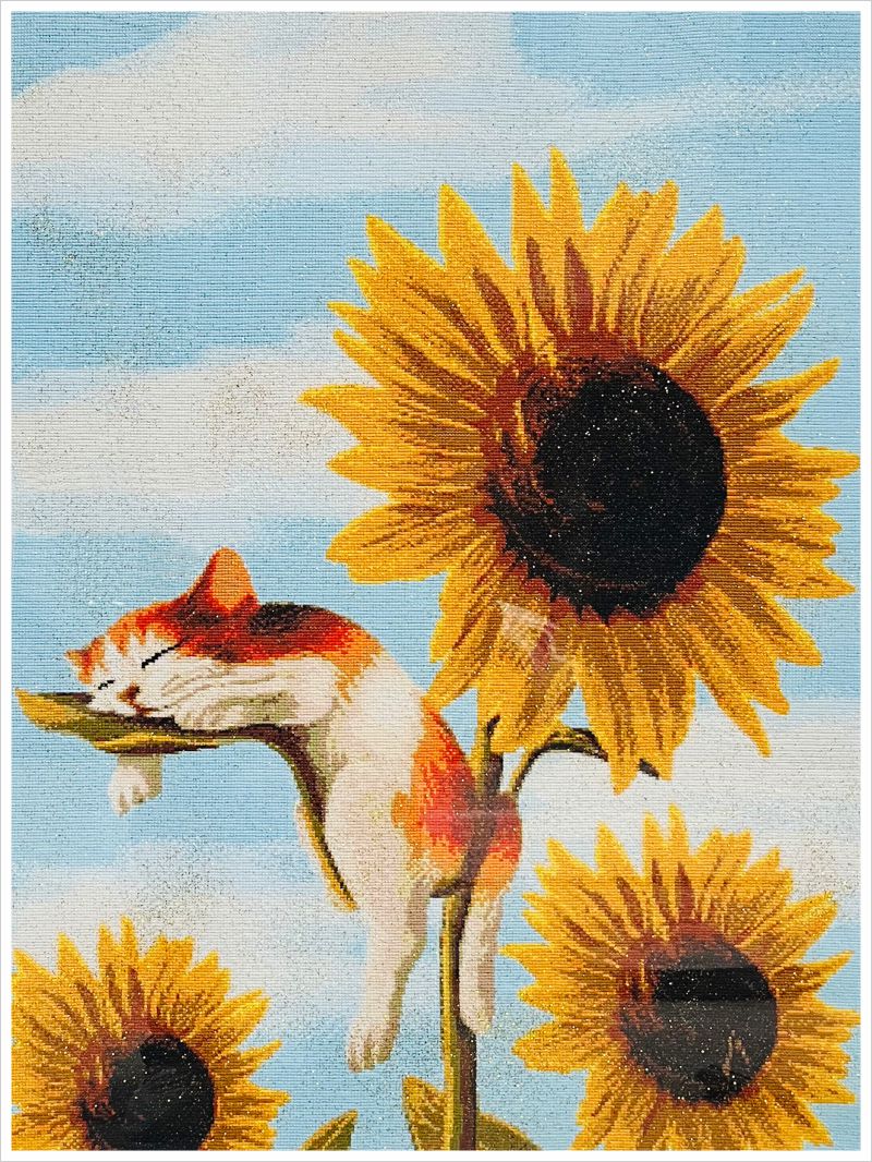 向日葵十字绣,该画面的背景素雅温和,画面较小,采用约5cm宽的C099白金线条配合1.8mm专用透明玻璃装裱,与画面配合将显得整个画秀气美观,整画重量将会较轻。