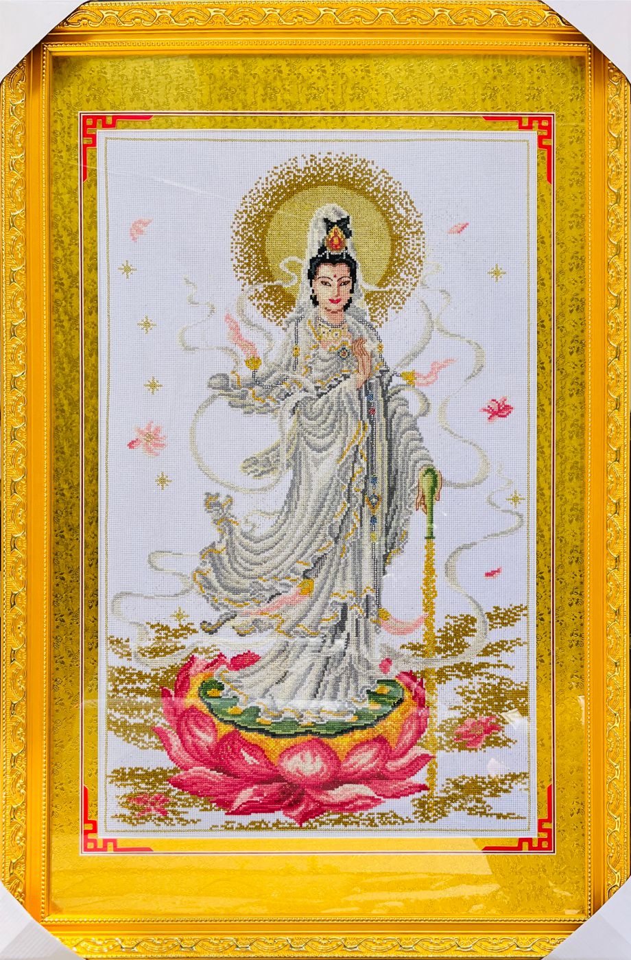 滴水观音莲花菩萨佛像画十字绣,是一张非满绣的手工刺绣画,画布以奶白色为底,背景金色使用特亮丝线,内容使用生态棉线,全线38种色,绣画尺寸52*84cm,裱后总画约1.05m,该画采用约4.5cm宽的亮金色线条配合约1.8mm专用装裱玻璃进行装裱,以金色系列卡纸配以红线的搭配使得画面更显大气庄重、奢华感,金色线条在装裱中的应用,能够显著提升画作的视觉表现力与艺术价值。
