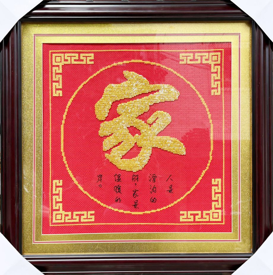 红色喜庆家字十字绣,是一张非满绣的小型珠绣手工刺绣画,画布以红色为底,内容使用生态棉线,中间家字使用的串珠,使效果看起来更为亮丽,绣画尺寸41*41cm,裱后总画约0.61m,该画采用约4.5cm宽的朱红色线条配合约1.8mm专用装裱玻璃进行装裱,以金色系列卡纸配以红线的搭配使得画面更显庄重、奢华感,朱红色线条在装裱中的应用,能够显著提升画作的视觉表现力与艺术价值。