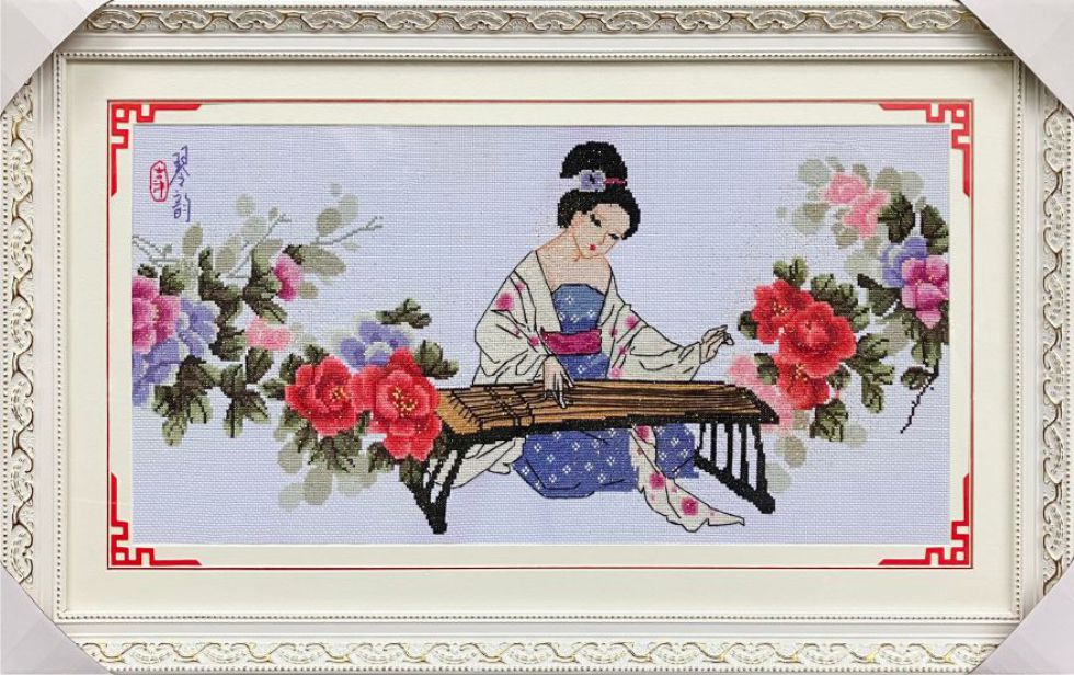 美女抚琴图天姿国色琴韵C099白金十字绣,是一张中等尺寸的非满绣的手工刺绣画,背景为纯色布,净画约0.75m×0.4m,裱后总画约0.9m,该画采用约4.7cm宽的白色线条配合约1.8mm厚裱画专用透明玻璃进行装裱,白色边条装裱作为一种经典且中性的颜色,能够很好地衬托出中间鲜艳的画作,使其色彩更加鲜明、生动。白色边条不仅能够凸显画作的主体地位,还能通过颜色的对比,增强整体的视觉效果,整体的层次感让画作看起来更加专业和高级。